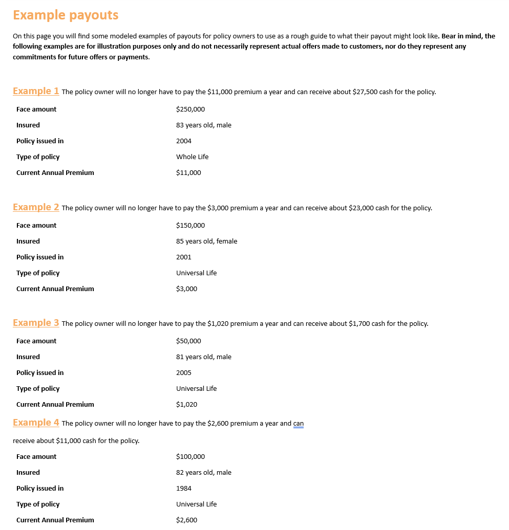 View some sample payments the policy owner can receive on a policy with a face amount of less than $500,000.